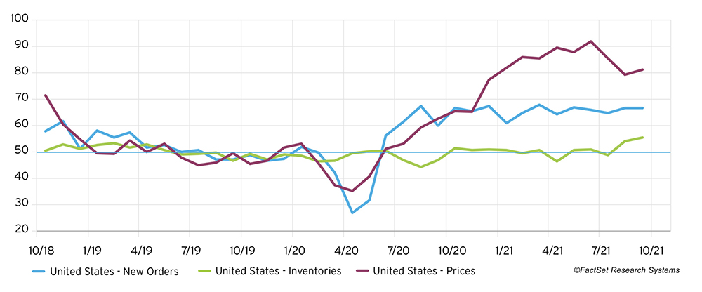 Once inland, trucking capacity constraints have made moving goods difficult, but relative to shipping challenges, the domestic freight capabilities have been more efficient. Order backlog has expanded for fifteen consecutive months, and inventories have not been able to meet the same expansion rate as new orders (levels above 50 indicate m/m expansion).3